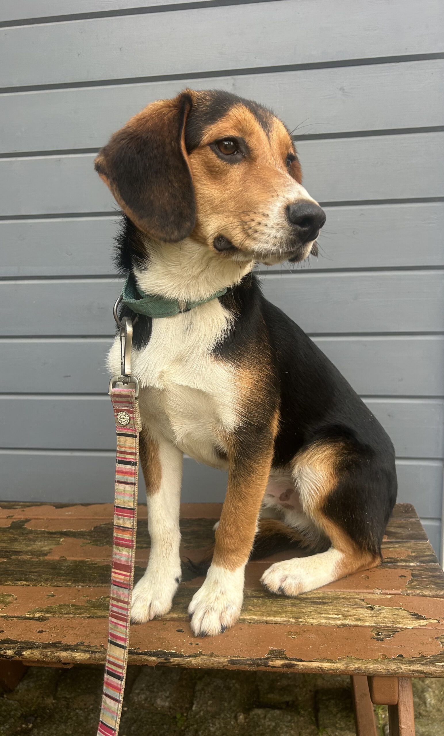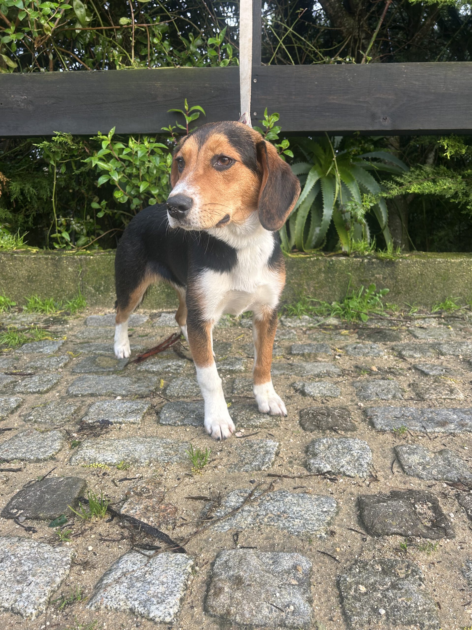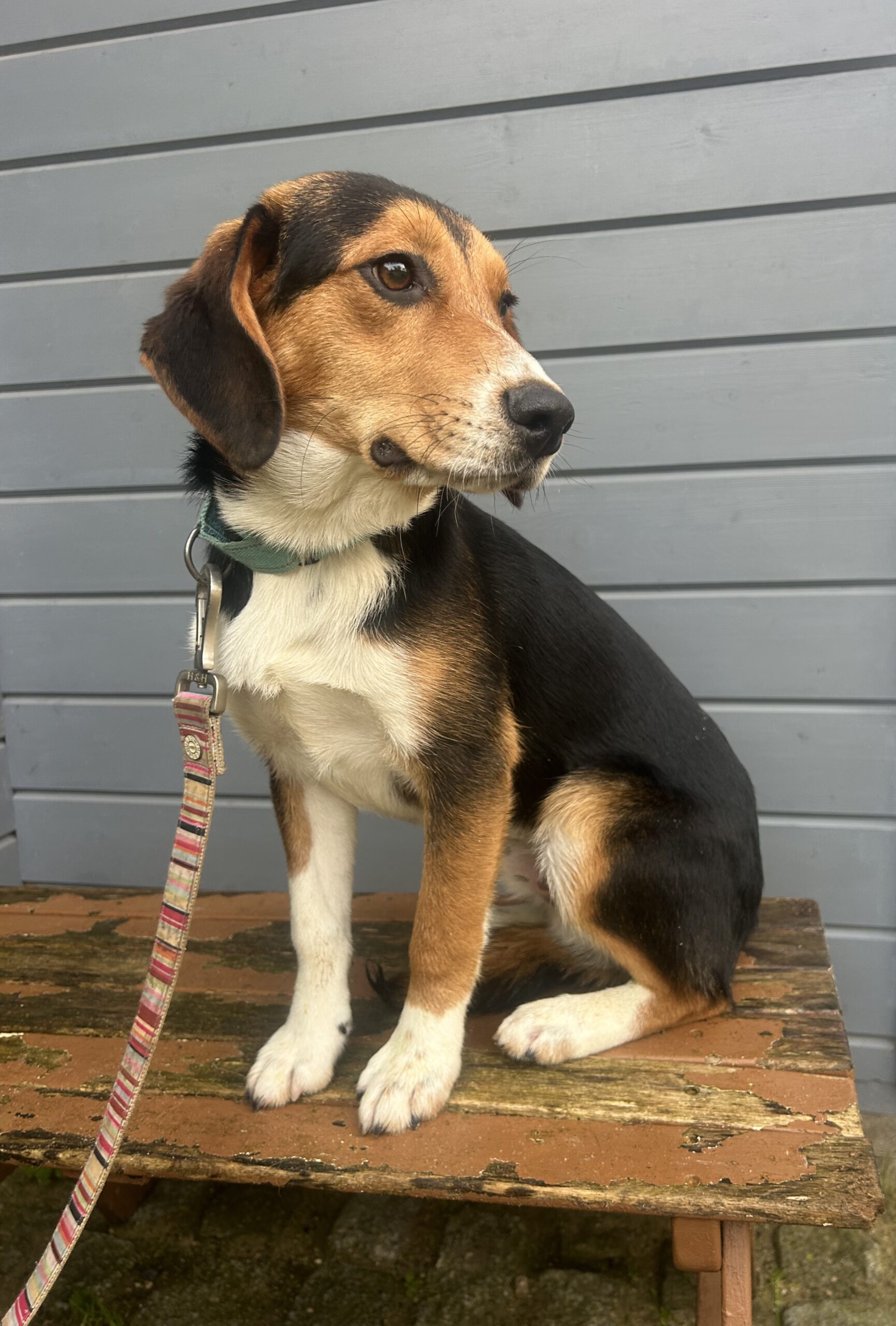 Sein Erscheinungsbild lässt auf einen Jagdhund-Mix schließen. Jagdliche Motivation kann sich mit zunehmendem Alter noch entwickeln. Rückruf und Orientierung sollten von Beginn an sauber aufgebaut werden, damit er nicht lernt, zu sehr sein eigenes Ding zu machen – auch das gehört zu seiner Genetik.