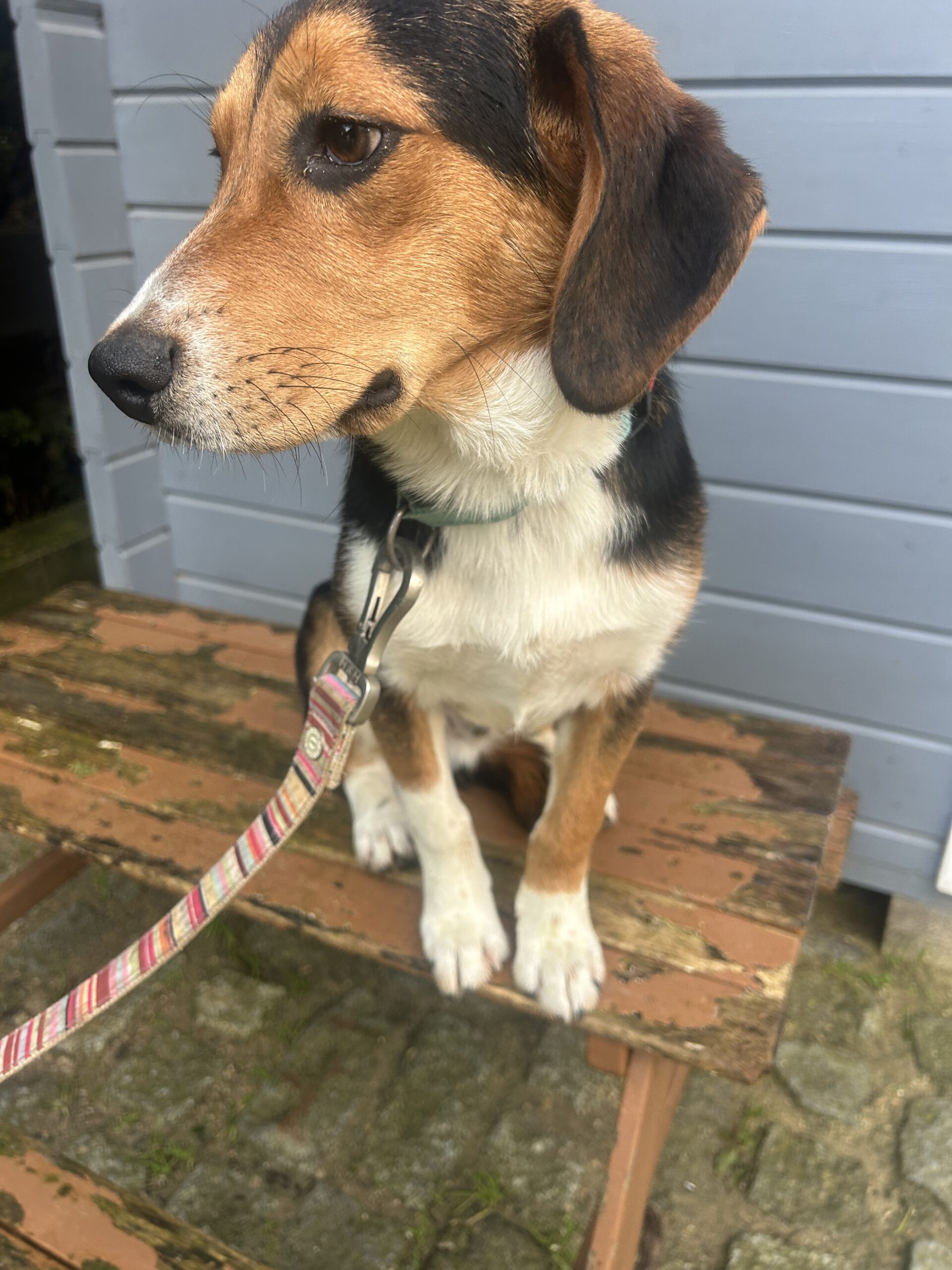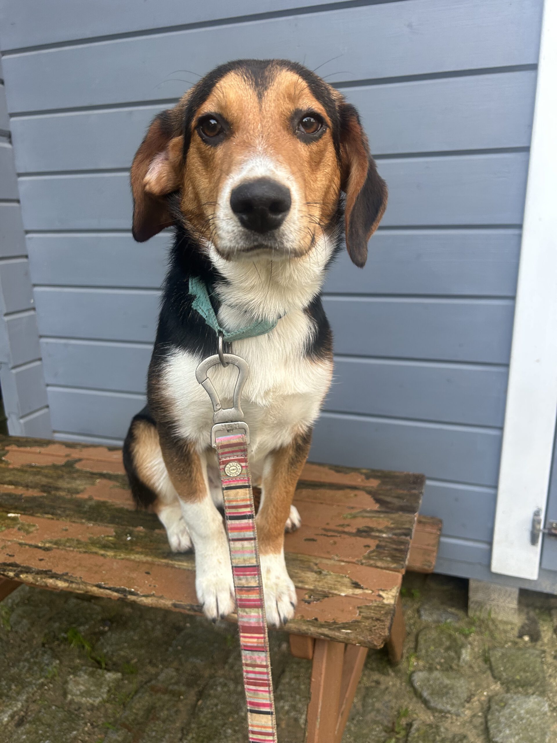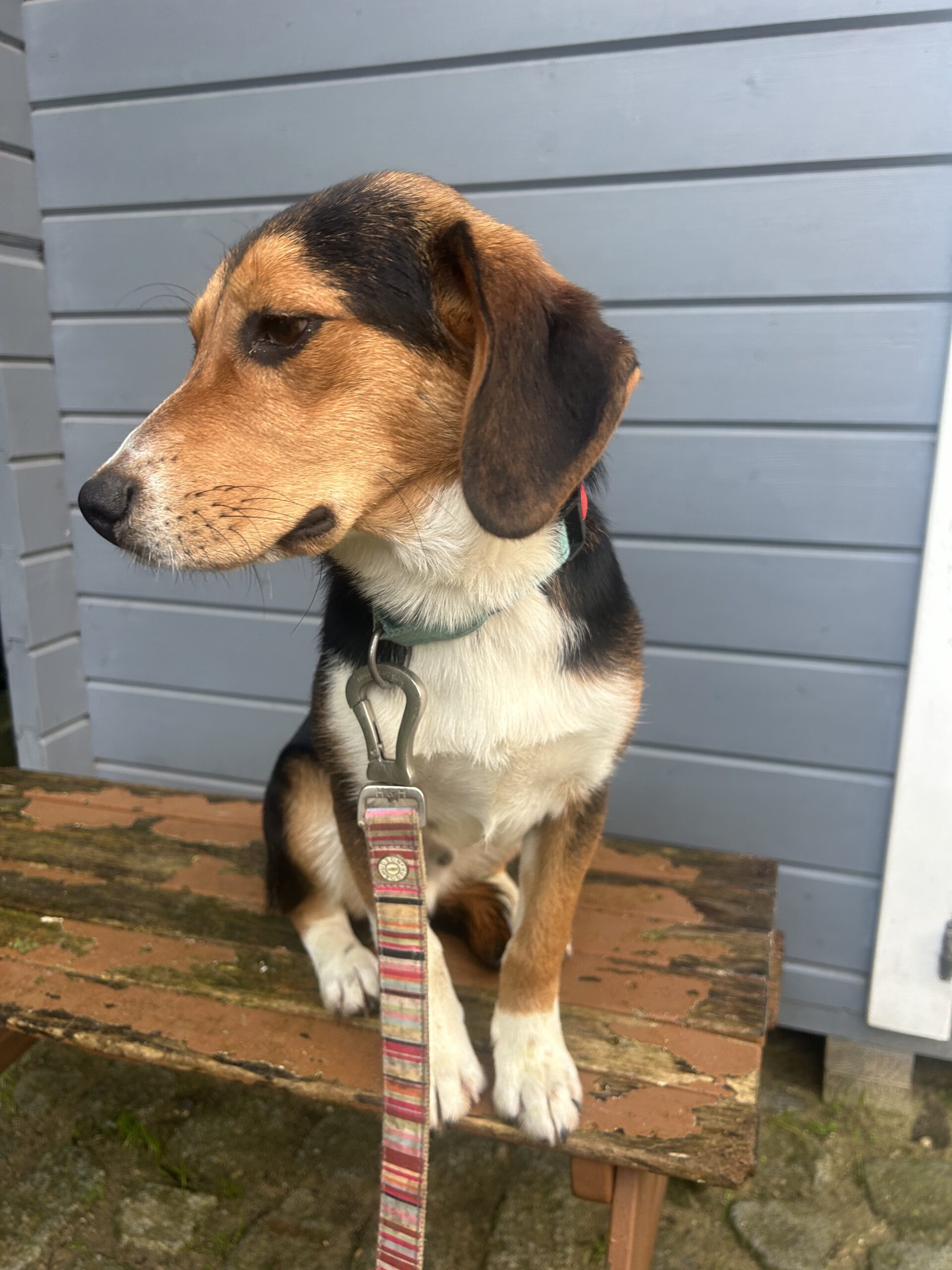 Sein Erscheinungsbild lässt auf einen Jagdhund-Mix schließen. Jagdliche Motivation kann sich mit zunehmendem Alter noch entwickeln. Rückruf und Orientierung sollten von Beginn an sauber aufgebaut werden, damit er nicht lernt, zu sehr sein eigenes Ding zu machen – auch das gehört zu seiner Genetik.