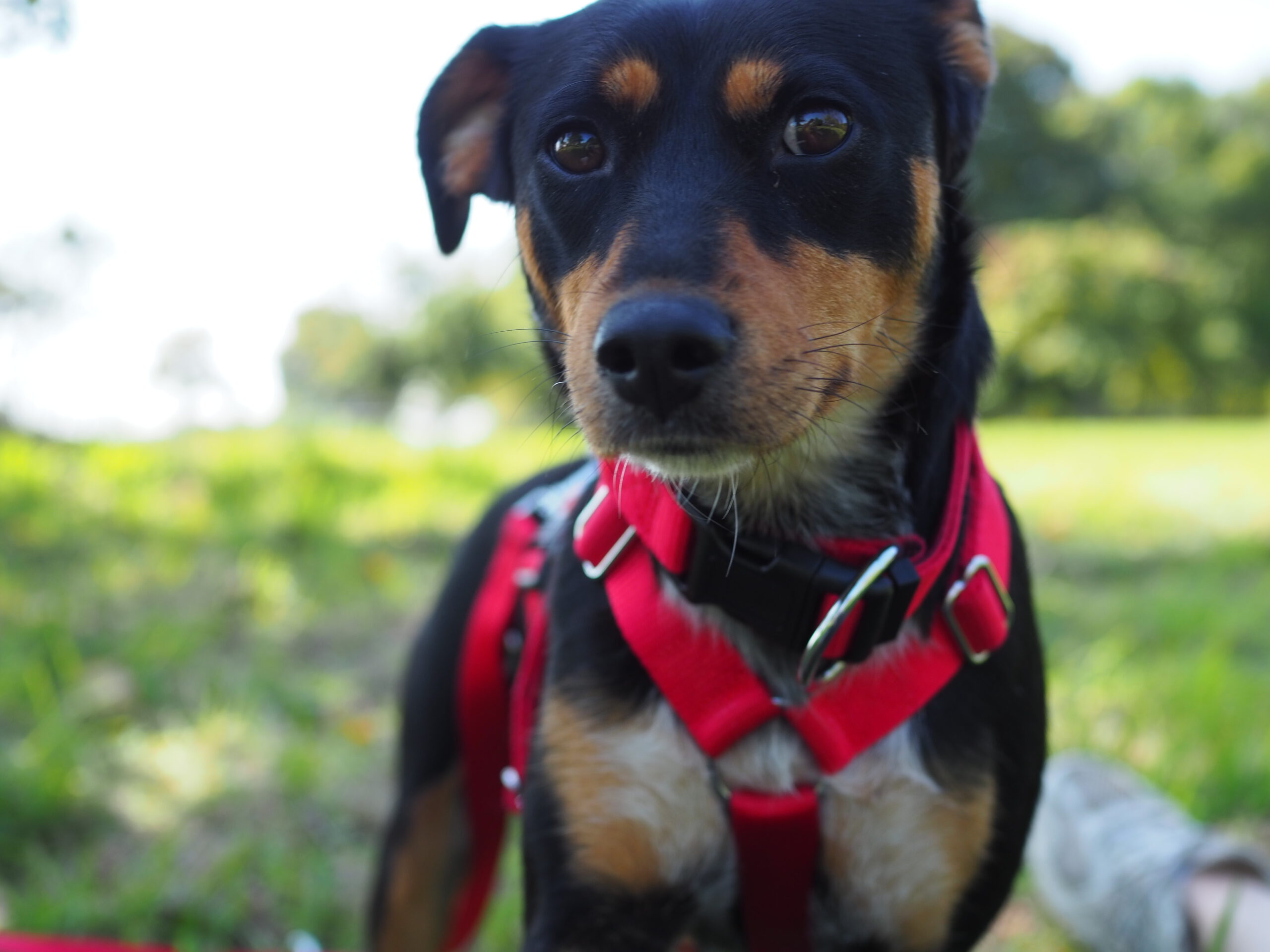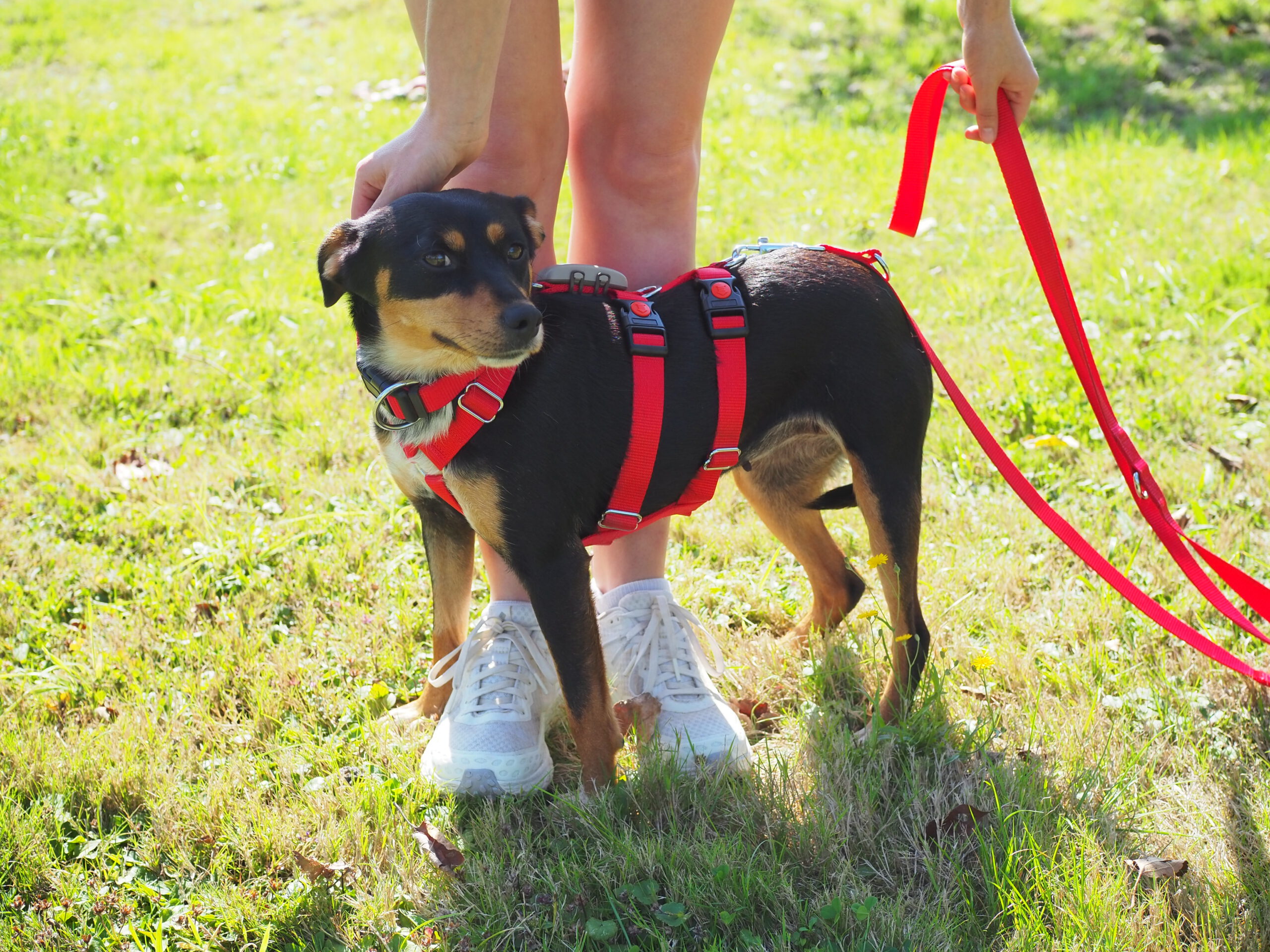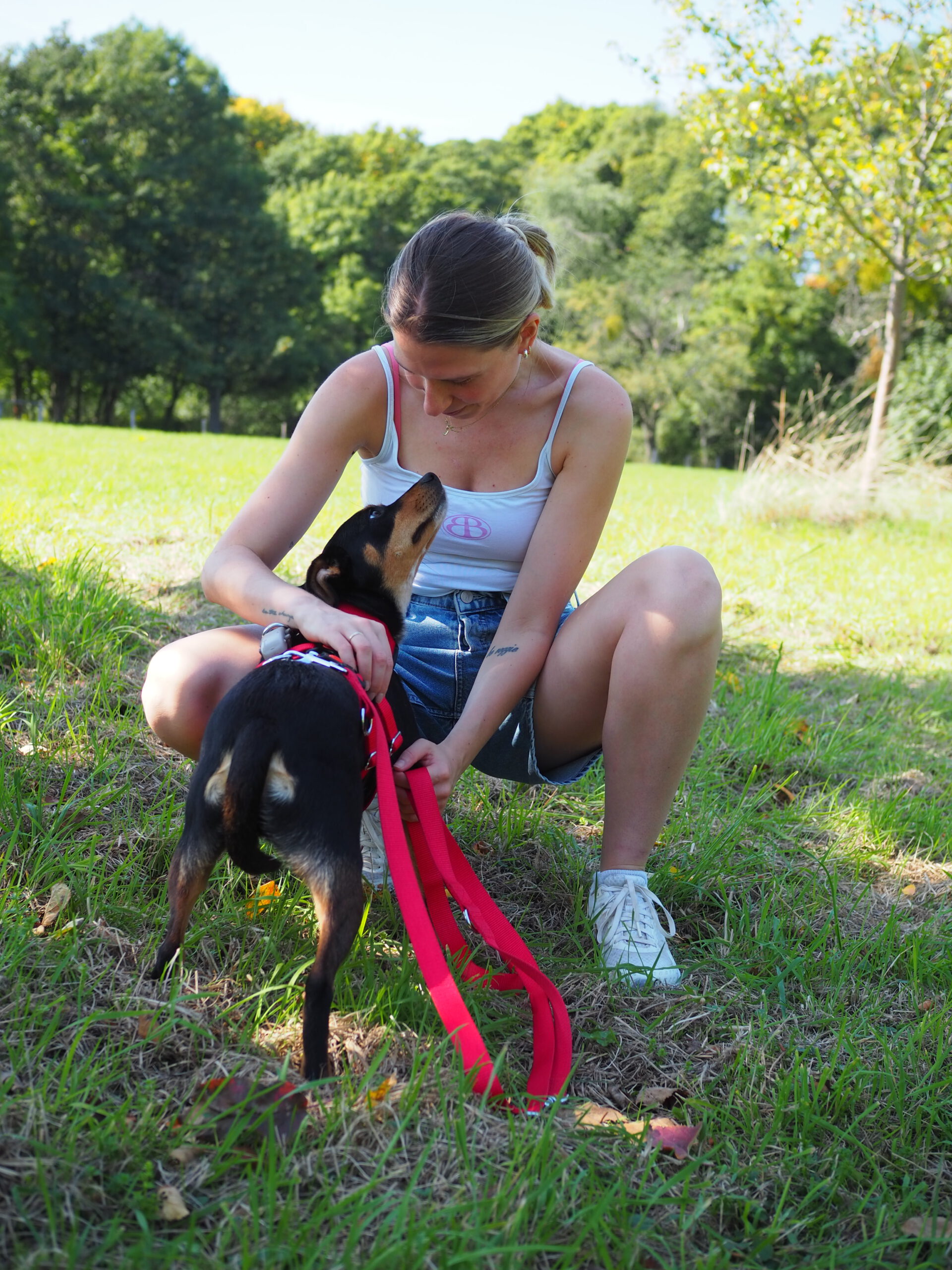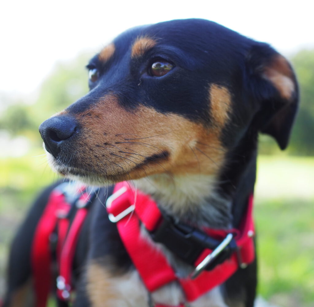 Auch draußen entwickelt sie sich toll: Hundebegegnungen nimmt sie gelassen hin, schaut kurz und geht dann einfach weiter. Im Park löst sie sich inzwischen zuverlässig, im Wald ist es ihr noch etwas zu aufregend. Bei lauten Geräuschen oder unruhigen Situationen sucht sie Schutz bei ihren Bezugspersonen – hier ist souveräne Begleitung wichtig, damit sie Schritt für Schritt sicherer wird. Einen stark ausgeprägten Jagdtrieb konnten wir bisher nicht beobachten, Eichhörnchen sind aber interessant.